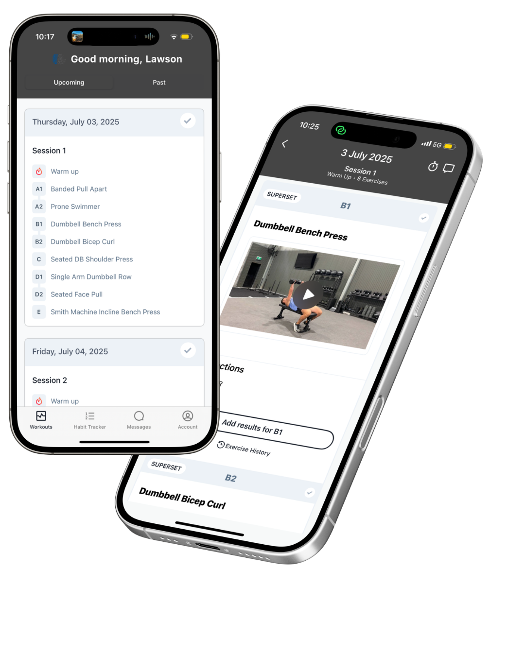 Personalised strength and conditioning programming delivered directly to your phone. Whether you're managing early meetings, interstate travel, or long work days, your training adapts to your life, not the other way around.